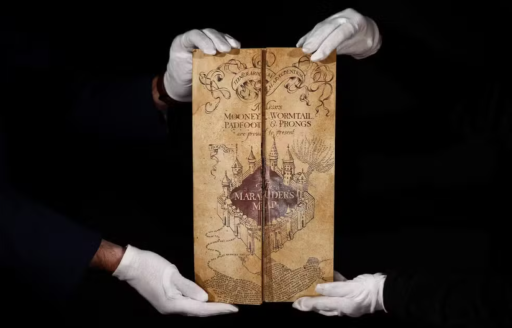 Já o Mapa do Maroto, visto nos filmes da franquia Harry Potter e o Prisioneiro de Azkaban, também integra o leilão, com valor estimado de até 80 mil dólares. O item tornou-se um dos símbolos mais reconhecidos da saga, associado diretamente ao universo de Hogwarts e à expansão da narrativa mágica nos cinemas.