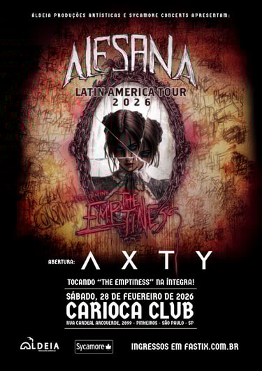 A abertura da noite ficará a cargo da Axty, banda formada em São Paulo em 2021 e apontada como um dos nomes em ascensão no metal moderno brasileiro. O grupo combina metalcore, deathcore e influências contemporâneas, com foco em peso, melodias marcantes e abordagem emocional intensa.