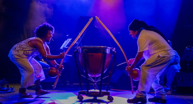 Reconhecido internacionalmente, Naná Vasconcelos construiu uma carreira marcada pela expansão dos limites da percussão. Eleito nove vezes o Melhor Percussionista do Mundo pela revista americana Down Beat e vencedor de oito prêmios Grammy, o músico levou instrumentos como o berimbau a contextos até então pouco explorados, dialogando com o jazz, a música experimental e as tradições populares brasileiras.