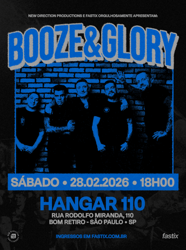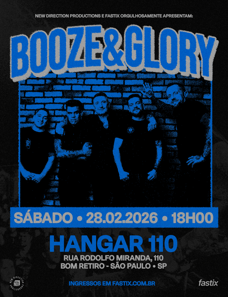 A banda britânica Booze & Glory tem data marcada para retornar ao Brasil em 2026. O grupo se apresenta em São Paulo no dia 28 de fevereiro, em um show único no Hangar 110, espaço historicamente associado à cena punk, hardcore e underground da capital paulista. A apresentação faz parte da turnê de divulgação do álbum Whiskey, Tango & Foxtrot e tem realização da ND Productions em parceria com a Fastix.