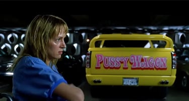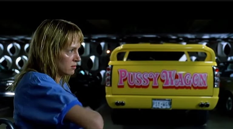 Cena original de Kill Bill com a Noiva diante do icônico “Pussy Wagon”, veículo que inspirou a sequência animada lançada anos depois — Foto: Reprodução / Miramax