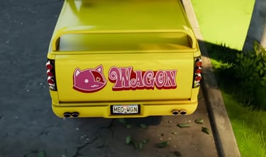 Versão recriada do “Pussy Wagon” dentro de Fortnite, adaptada com nova identidade visual para a cena inspirada na sequência cortada de Kill Bill — Imagem: Epic Games