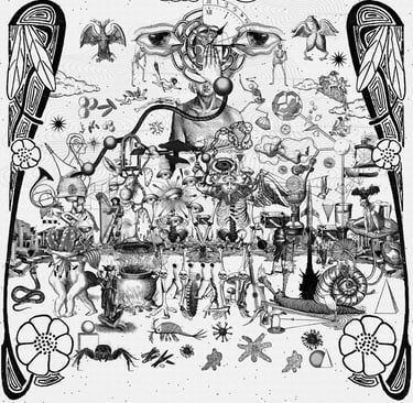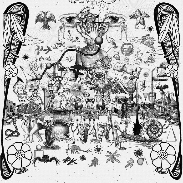 Capa do álbum Cosmo Room: a arte mistura colagens e elementos surrealistas para refletir os contrastes, texturas e a densidade instrumental presentes nas composições do disco de estreia da banda.