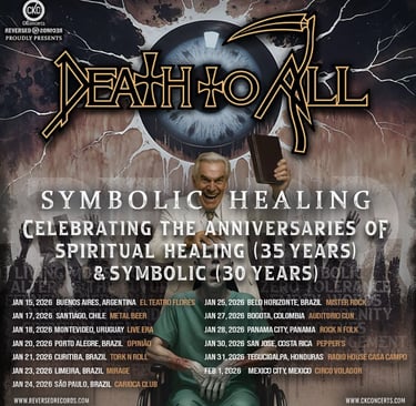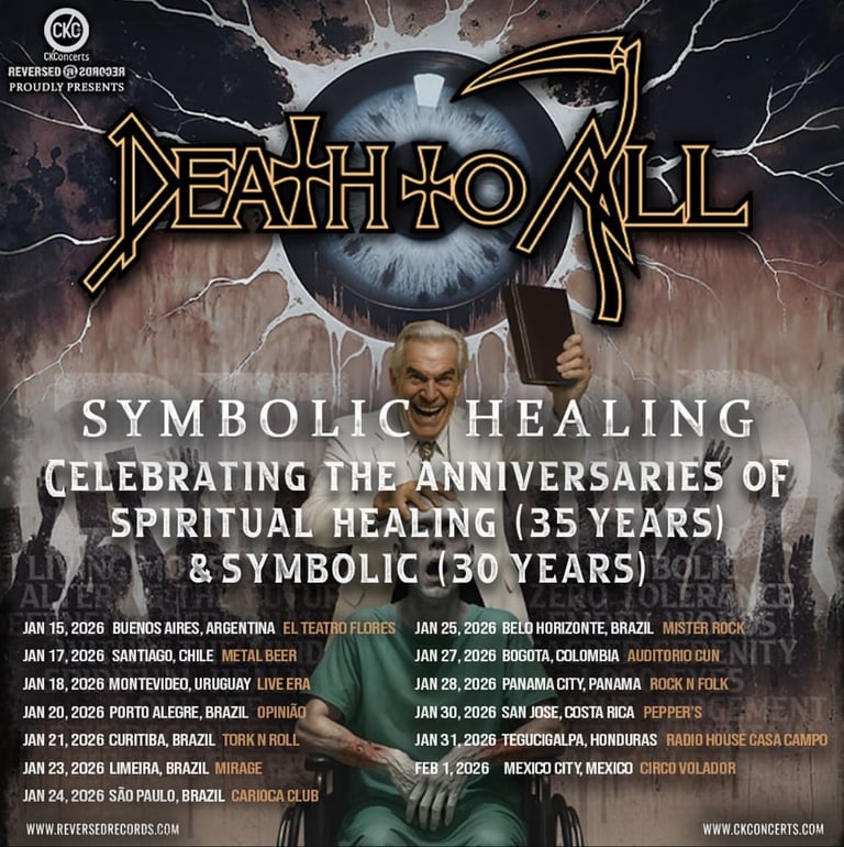 O Death to All, projeto formado por ex-integrantes da banda norte-americana Death, está no Brasil em janeiro para uma série de apresentações que revisitam dois marcos fundamentais da história do death metal. A turnê celebra Spiritual Healing (1990) e Symbolic (1995), discos que completam, respectivamente, 35 e 30 anos desde seus lançamentos. As apresentações acontecem entre os dias 20 e 25 de janeiro, passando por cinco cidades brasileiras, com produção da Overload em quatro das datas.