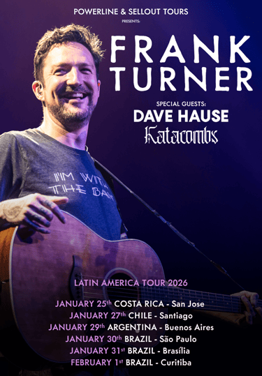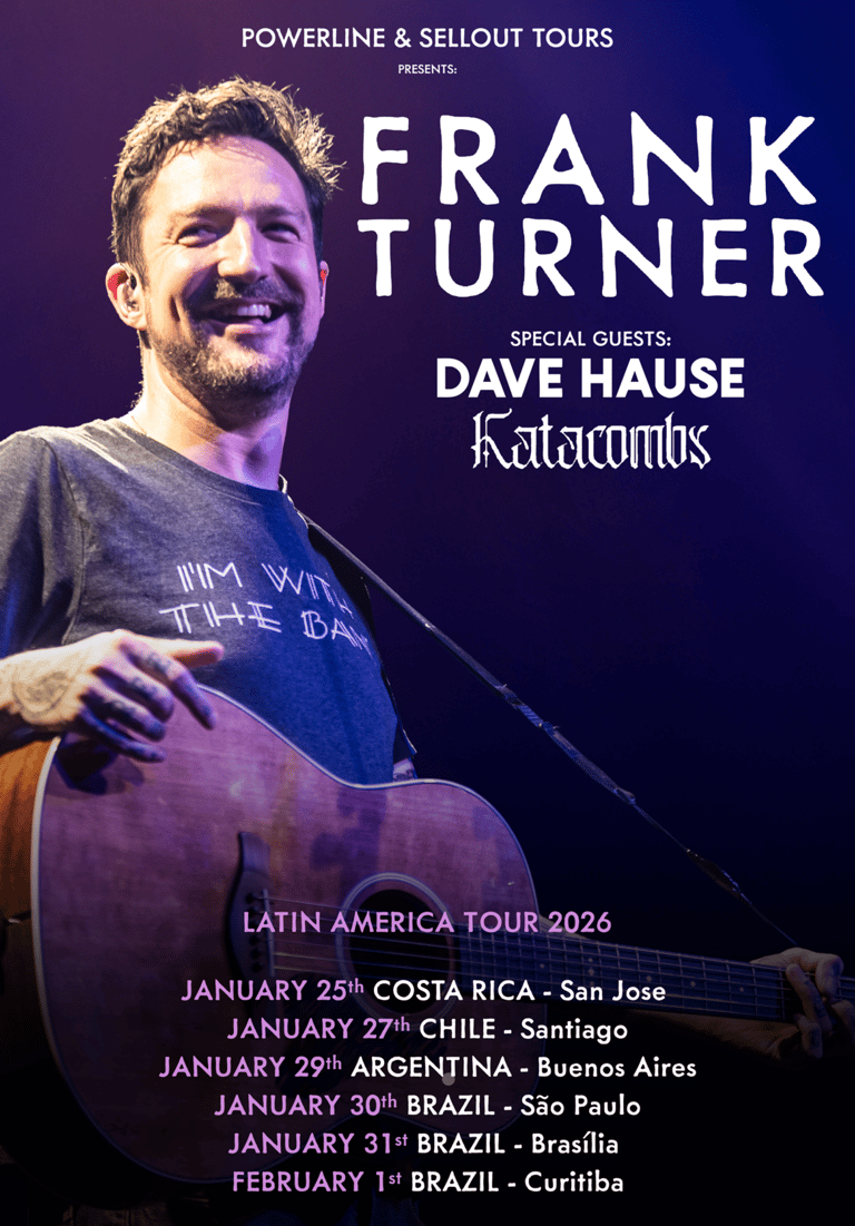 A espera dos fãs brasileiros de folk punk finalmente chegou ao fim. Frank Turner, um dos nomes mais prolíficos do gênero na última década, desembarca pela primeira vez no Brasil em janeiro de 2026. O cantor e compositor inglês, conhecido pelo trabalho intenso na estrada e pela postura engajada em causas sociais, integra a nova turnê latino-americana que passa por São Paulo, Brasília e Curitiba entre os dias 30 de janeiro e 1º de fevereiro. A realização é da Powerline Music & Books em parceria com a Sellout Tours, abrindo o calendário do underground internacional do próximo ano.