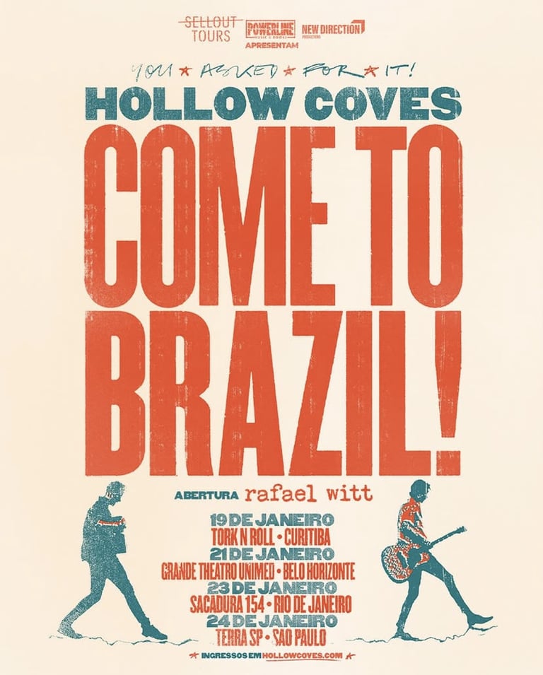 Pela primeira vez no Brasil, o duo australiano Hollow Coves desembarca no país para uma série de quatro apresentações ao longo do mês de janeiro. Formado por Matt Carins e Ryan Henderson, o projeto construiu sua reputação a partir de um indie folk de caráter introspectivo, marcado por letras confessionais e arranjos acústicos que priorizam clima e sensibilidade. A turnê brasileira contempla shows em Curitiba (19/01), Belo Horizonte (21/01), Rio de Janeiro (23/01) e São Paulo (24/01), com realização das produtoras Sellout Tours, Powerline Music & Books e ND Productions.