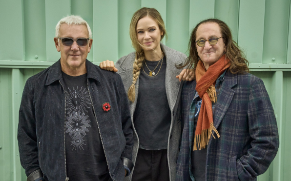 Geddy Lee, Anika Nilles e Alex Lifeson na foto oficial que apresenta a nova formação do RUSH ao público, marcando o início de uma nova etapa na trajetória da banda.