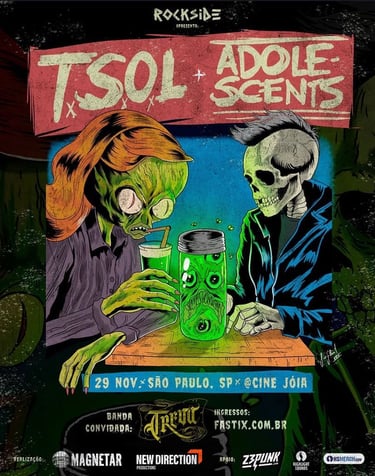 As raízes do punk californiano voltam a ecoar em São Paulo neste sábado (29), quando T.S.O.L. e Adolescents sobem ao palco do Cine Joia para uma noite que promete juntar gerações de fãs, colecionadores de discos, curiosos e veteranos da cena hardcore. Mesmo sem holofotes grandiosos, ambas as bandas seguem vivas, produtivas e com público fiel no Brasil — país que tradicionalmente abraçou o punk norte-americano desde os anos 1980.